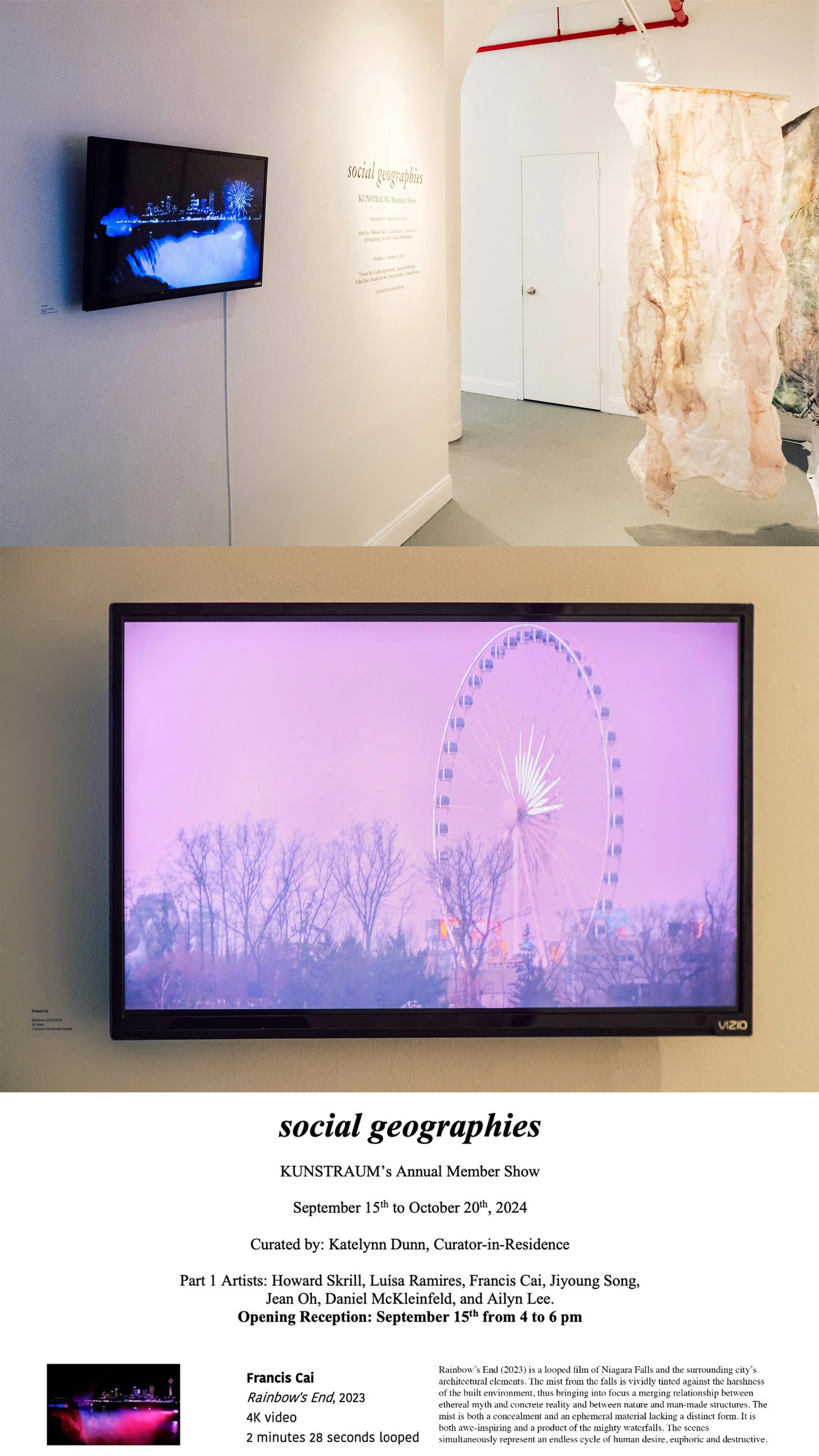 Rainbow’s End (2023) is a looped film of Niagara Falls and the surrounding city’s architectural elements. The mist from the falls is vividly tinted against the harshness of the built environment, thus bringing into focus a merging relationship between ethereal myth and concrete reality and between nature and man-made structures. The mist is both a concealment and an ephemeral material lacking a distinct form. It is both awe-inspiring and a product of the mighty waterfalls. The scenes simultaneously represent an endless cycle of human desire, euphoric and destructive.